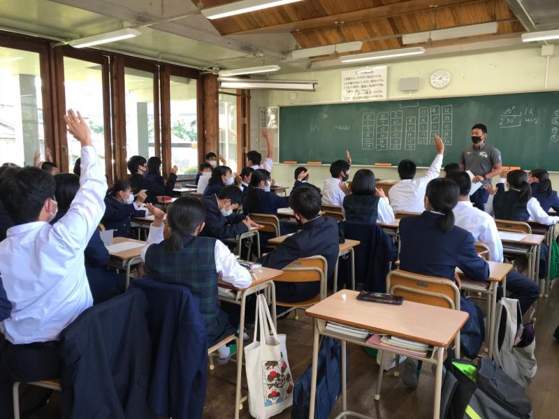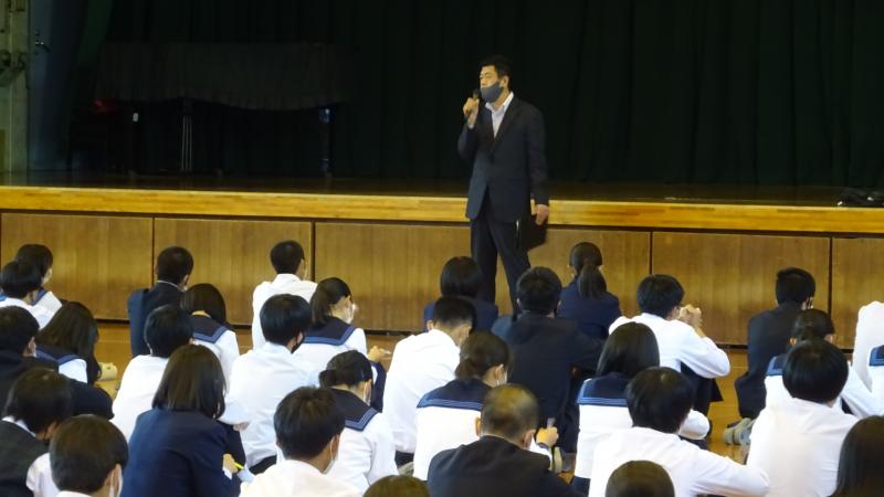 お昼休みをはさみ、午後からはまず研究企画兼情報管理部主任の竹中先生よりお話がありました。東稜高校の指導方針等の紹介に重ねて様々な言葉を生徒に紹介されました。「授業第一主義」「生き方在り方を育てる」「心温かきは万能なり」「何をしてもらうかではなく何ができるか」「(高校生は)守られる側ではなく守る側」「素直さは知性」「大切なのはこれからどう生きていくか」等々。スマホとの付き合い方を考える、生活習慣を整える、努力の見える化をすることも大事だというアドバイスもあり、生徒たちは様々な言葉をメモしていたようでした。