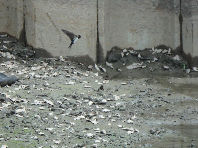 ツバメが巣作りをしていました。同じツバメか分かりませんが、調整池の泥をくわえて運ぶツバメと天井に巣をつくっているツバメがいました。どちらも2羽で行き来していました。