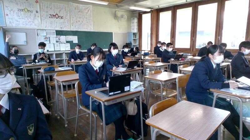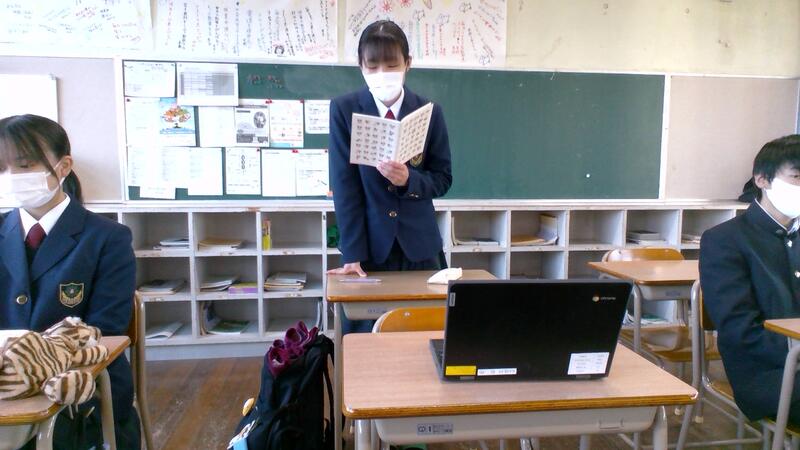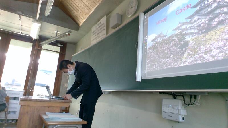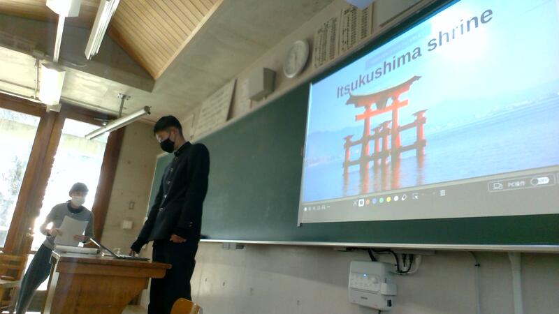 1-2コミュニケーション英語・・・「日本の世界自然遺産」について、一人一人が調べ、まとめてきたプレゼンテーションについて、英語で発表をし、質疑応答に答える時間でした。
