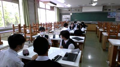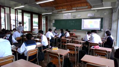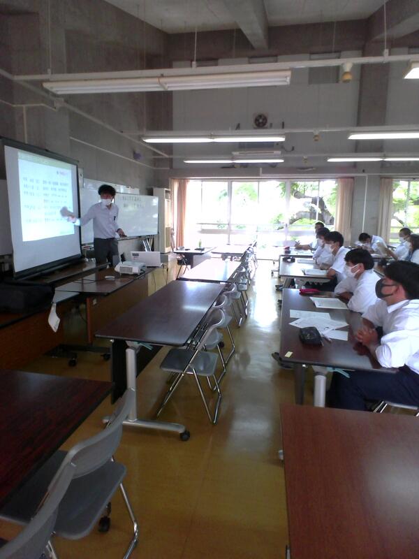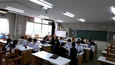 6月1日(水)3限目、教育実習生の境目先生が研究授業を行いました。対象は第2学年5・6・7・8(理数コース)組の日本史選択者、場所は多目的室で実施しました。