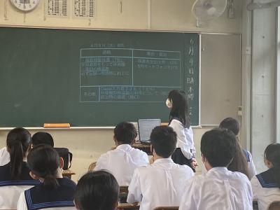担任の先生が、朝の連絡事項をWeb上にまとめていますので、それを係生徒がPC/プロジェクターを活用し、黒板に投影します。朝読書の時間が終わると、日直が前へ出て、一日の連絡事項を説明します。