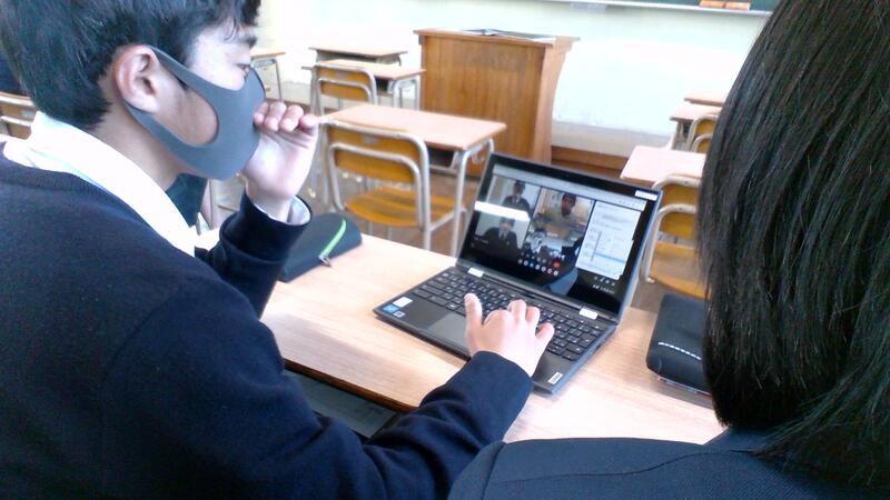 1年7組では、7班毎に別々のmeet room(ブレイクアウトルーム)を使って、班ごとの話し合いを行いました。生徒同士の対話からテーマに関するアイデアが生まれています。先生も入り、指導・助言を行いました。