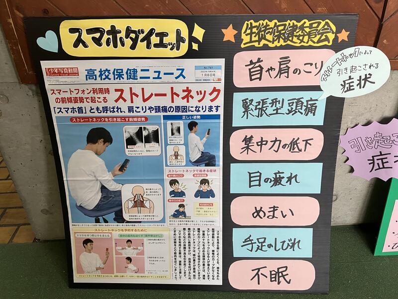 保健委員会では、「スマートフォン利用時の前傾姿勢で起こるストレートネック」に関することをパネルにまとめ、生徒昇降口に掲示しました。「ネット依存症の影響と改善方法について」もまとめ、掲示を行っています。