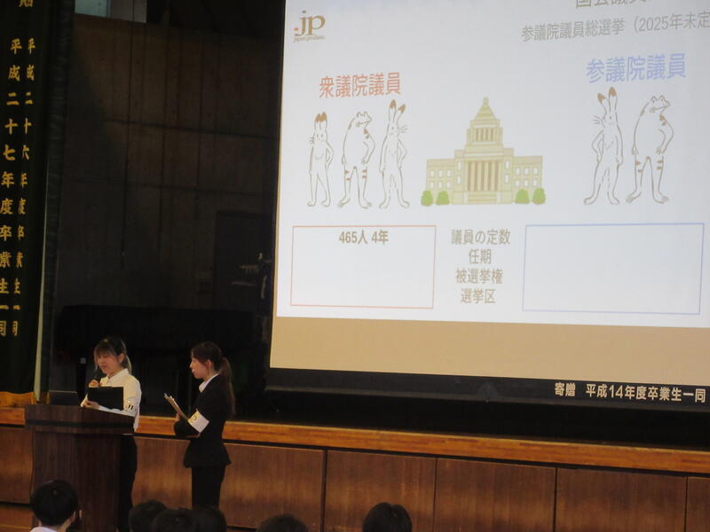 34期の卒業生を含めた4名の大学生の方から選挙の仕組みや投票の仕方を教えていただきました。