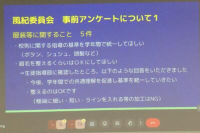 各委員会ごとに昨年度の活動報告、今年度の活動計画の発表、生徒事前アンケ