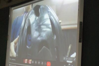 交通委員会からは、実際に交通事故に遭ったときのヘルメットを見せながら