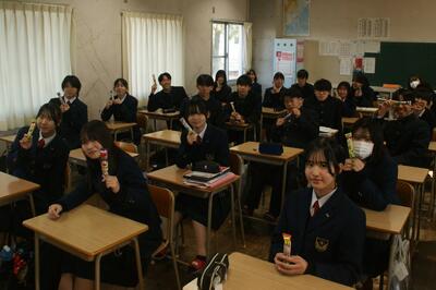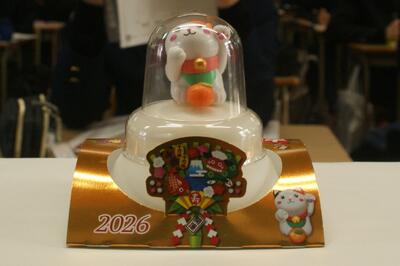 LHRでは心ばかりのお年玉(うまい棒1本)を生徒に配り、担任