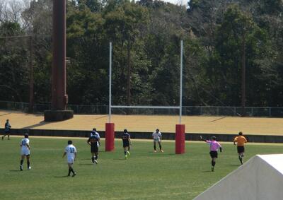 開始から合同Aは玖珠美山陣内に攻め込むものの、前半2分パスを玖珠美山CTBにインターセプトされ、そのまま80m独走されてトライ(ゴール成功)されました。この後も玖珠美山の堅守が続き、合同Aにとっては、攻め込んでは、ボールを奪われ得点される展開となりました。後半に入っても同じ展開となり0ー49となった後半6分、合同Aは一気に4人選手を入れ換えました。その後、後半7分にトライ(ゴール成功)を許しましたが、その後は両者得点なく、試合終了となりました。