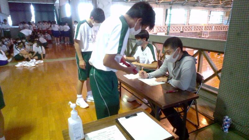 事前にHRで点呼・本日の流れについて説明があり、クラスごとに測定会場(体育館・グラウンド)に集合し、全体説明・諸注意がありました。