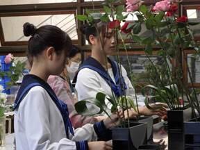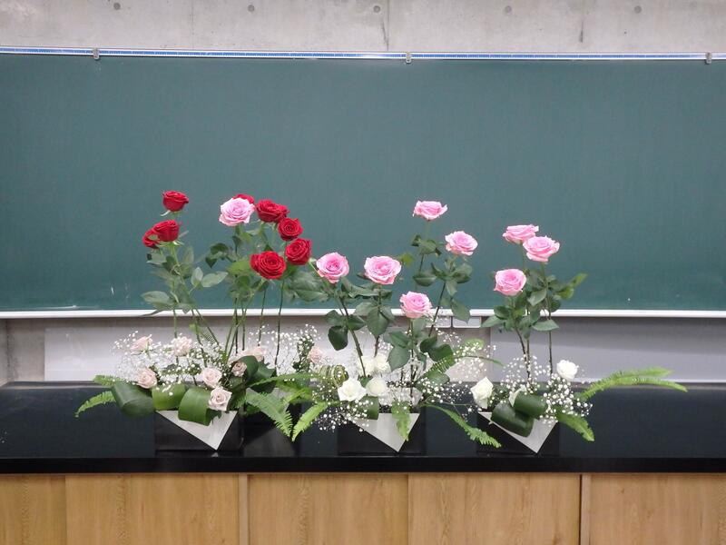 3年生が参加する最後の日なので、合作をいけました。花材は3年生の希望でバラの花です。完成後は卒業アルバム用の写真を撮って、生徒昇降口のところに展示しました。