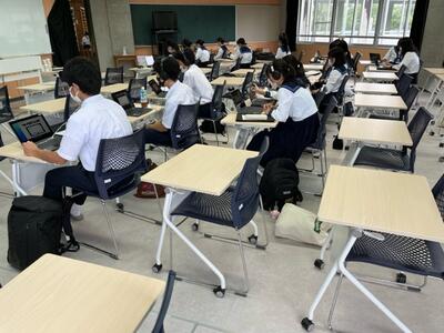 生徒は前のスクリーンに映し出された資料や事前に生徒端末に配布された資料を参考にしながら、講演を聞いていました。