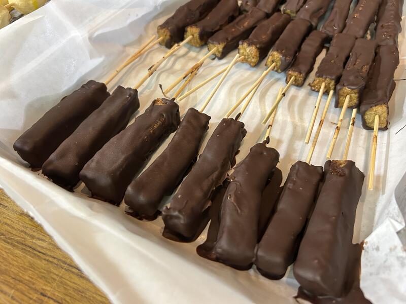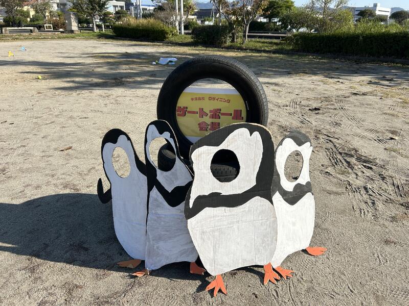 ゲートボール会場のセッティング中 「原かまぼこ」さんとのコラボ商品「いわチョコボー」
