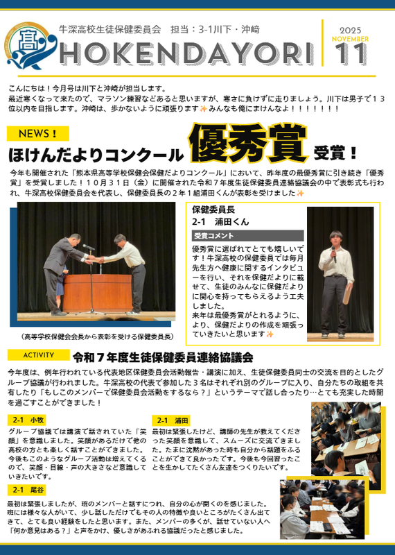 熊本県高等学校保健会保健だよりコンクールにおいて「優秀賞」を受賞した牛高の「ほけんだより」です!