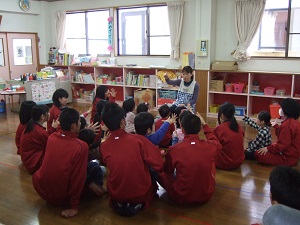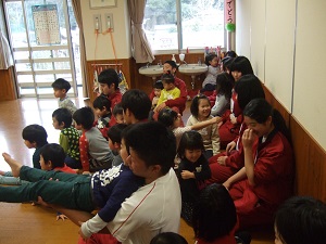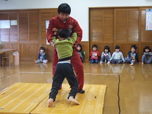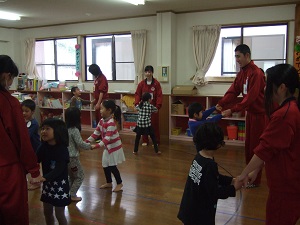 あいにくの天気で、園庭で遊ぶことはできませんでしたが、室内で椅子取りゲーム、相撲、絵本の読み聞かせをしながら一緒に遊びました。
