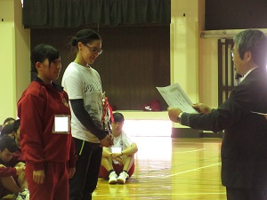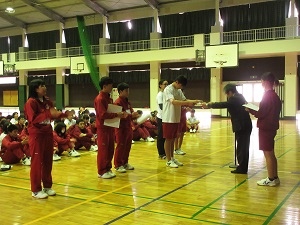 はじめに表彰式が行われ、吹奏楽部・書道部・城南新人駅伝大会(女子)・皆勤賞・精勤賞・第3回校内英単語オリンピック成績優秀賞・平成30年度校内英単語オリンピック年間総合成績優秀者賞の表彰を行いました。