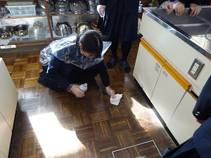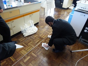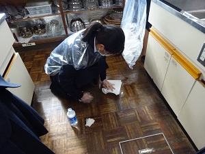 3年次選択「子どもの発達と保育」の授業では、「嘔吐物処理実習」を行いました。適切な処理で周囲への感染を防ぐことができます。ポイントに沿って、真剣に実習に取り組みました。