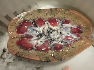 ③切開し、皮質、髄質、腎うを観察。皮質の墨汁で染まった黒い粒々糸球体。