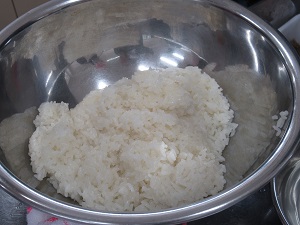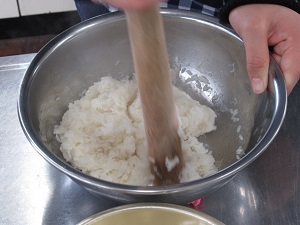 炊飯器で炊いたお米をすりこぎで、すりつぶす。