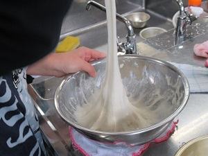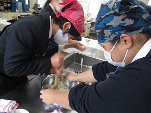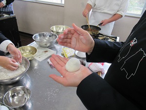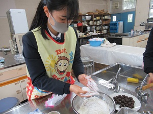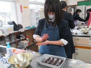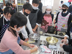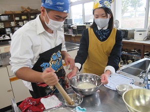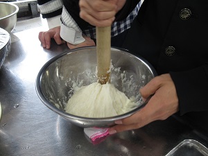 3年次選択「食文化」では、杵と臼を使わない餅つき実習を行いました。