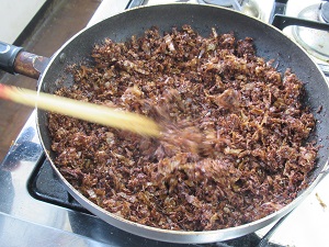 から煎りした後にしょうゆなどの調味料を加え、焦がさないよう弱火でじっくり炒めます。この日は、40分ぐらいいかけて炒めました。