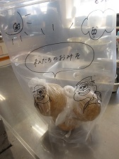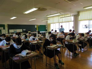 県教育委員会からいただいた「さらし」を使い、型紙にそって布を裁断した後、各自が好きな色の縫い糸で手縫いしました。40分短縮授業という限られた時間内ではありましたが、完成した生徒はさっそく着用し、イラストを加えて自分好みにカスタマイズするなど、楽しそうに実習を行っていました。担当教諭からは、「作り方を覚えて、休業期間中にぜひ家族の分も作ってほしい」との呼びかけがありました。このほかにも、家庭科では布やゴム、作り方の説明書・型紙などを入れた「布マスク製作キット」を全生徒分準備し、HRで配付して同様の呼びかけを行いました。