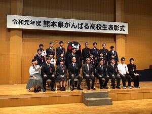 10月16日(水)、熊本県がんばる高校生表彰式が行われました。 生徒会長の畑中さんに蒲島知事から表彰状が贈られました。