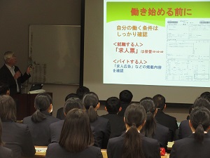 2月19日(水)2限目、3年次生を対象とした消費者教育講座があり、講師として熊本県金融広報委員会金融広報アドバイザーの橋野様にお越しいただきました。「消費者トラブルに遭わないために」と題して、契約の成立と取り消し、若者がターゲットとなる商法、ネットショッピングトラブル、多重債務問題など、事例を挙げながら分かりやすく話をしていただきました。将来トラブルに巻き込まれないように、うまい話は疑う、はっきりと断る、相談することが自分の身を守る手段であることを学ぶよい機会となりました。