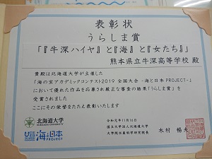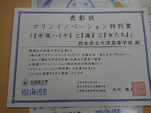 『「牛深ハイヤ」と「海」と「女たち」』のプレゼンテーションを行い、うらしま賞とマリンイノベーション特別賞(北海道マリンイノベーション株式会社特別賞)のW受賞となりました。