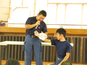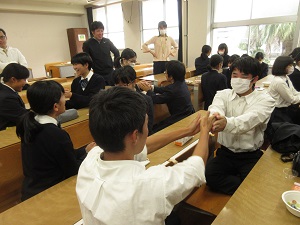 心肺蘇生法(119番通報、意識確認、胸骨圧迫、AEDの使用)、異物除去、止血法について学びました。署員の方は「いざという時に手を差し伸べることができる人になってほしい。勇気ある行動をしてほしい。」話されていました。生徒を代表し、吉浦くんが「今回の講習を覚えておき、いざという時におき、活かせるようにしたい」とお礼の言葉を述べました。