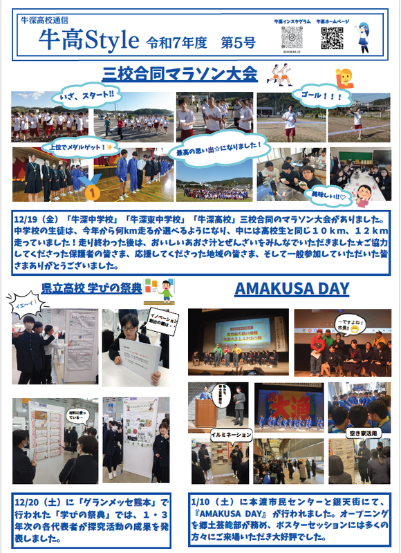 2月3日(火)放課後、みつばちラジオ「くるる」の人気コーナー『くるっと高校見聞録』へ本校の生徒2名が出演しました。1名は、2025年に頑張った取組として、委員長として主体的に取り組んだ委員会活動の内容について発表しました。また、もう1名は、昨年2年次が主体になり実施した牛深地域活性化イベント「ロゲイニング(るんるん♪うしぶかクエストin2025~地図を片手に、まちを攻略せよ~」も頑張ったことに挙げていました。また、将来についての話や「今年の一文字」をそれぞれ発表して、緊張しながらもしっかりとした発表でした。気になる今年の一文字はぜひラジオをお聞きください!!