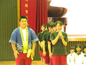 生徒の感想は「今回、日本一を取ることを目標とし、支えてくださった地域の方々、保護者、先生方への恩返しの気持ちを込めて大会に臨み、たくさんの練習をしてきた成果を十分に発揮することができ、最高の笑顔で楽しく披露することができました。大会の結果は、目標は達成できませんでしたが、牛深ハイヤ節の良さを会場の皆さんへ伝えることができました。来年もこの場に立てるようにこれからも練習に励んでいきます。貴重な経験をありがとうございました。」