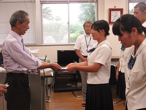 2月26日、家庭部の地域振興に係る活動に対し、一般財団法人ふくおかフィナンシャルグループ文化芸術財団より助成金が贈呈されました。これは、牛深の特産品である「あおさ」や「雑節」の消費増大をめざして行っている商品開発や普及のための活動が、地域振興に貢献していると認められたことによります。