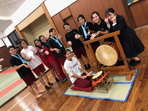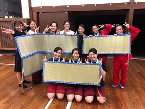 福岡様は舞台でゴザを使うなら運びやすいものをと、早速太鼓や三味線の採寸をしてくださり、その日のうちに作ってくださりました。郷土芸能部の生徒たちは出来上がったゴザを見て、大興奮の様子でした。ゴザは運びやすいようにコンパクトに畳んで結ぶことが出来ます。また、ゴザの縁はハイヤのイメージにぴったりな鮮やかな青色と魚介類の模様です。これから牛深を始め県内外の舞台でこのゴザを使って舞台を披露していけることを楽しみに、生徒たちは益々練習に励んでいきたいと意気込んでいました。福岡様、誠にありがとうございました。
