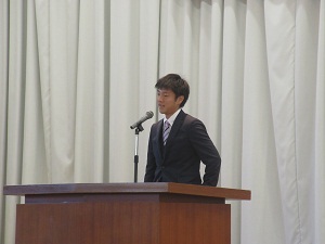 「小さい頃、子どもたちに夢を与えるサンタクロースの弟子になりたいという夢があった。パイロットやサッカー選手など、なりたいものがたくさんあったが、叶わない夢もあった。夢は持つだけではだめで、準備や計画、実行しなければ叶えられない。また夢を叶えたら終わりではなく、常に向上心を持つことが大切。夢がみつからない人は、まず目標をみつけよう。」とご自身の体験をもとに述べられました。