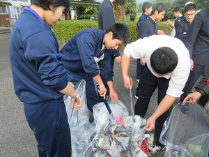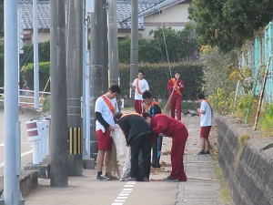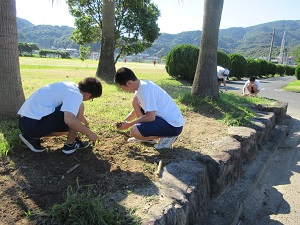 1年次は、武道場周辺の除草作業・側溝清掃、グランド・野球場の草集め、2年次は、学校周辺のごみ拾いを行いました。多くの生徒が参加し、わずか1時間の作業でしたが、きれいになりました。