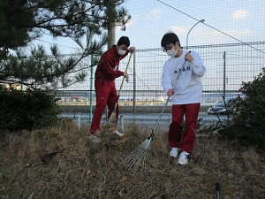 12月20日(火)、ボランティア活動を行い、校舎周辺のごみ拾い、落ち葉集めを行いました。