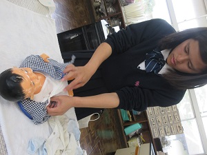 事前に学習した内容を振り返りながら、先生の手本を見学後は、一人ずつ実習を行いました。湯温の調節など難しいところもありましたが、子どもに話しかけながら、優しく接する姿がありました。