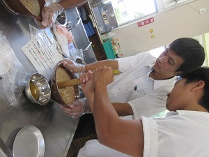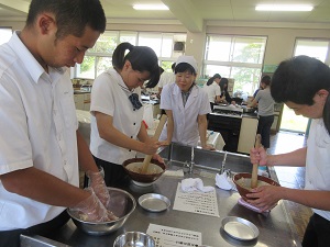 今回は、夏の高温多湿を利用して作られる発酵食品の中から「みそ作り」の体験を行いました。熊本県産大豆や天草の塩を使い、2人1組で作りました。大豆をすりつぶす作業は、時間と体力を使う作業でした。完成が待ち遠しいです。