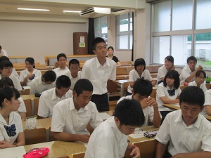 グループに分かれ自己紹介を行い、「牛高校舎すごろくゲーム」や折り紙や新聞紙でかぶと作りなど、短い時間でさまざまな活動を楽しみました。学校の紹介をしたり、けん玉やだるま落としなどがあり、生徒も盛り上がりました。最後は、校歌を歌いました。