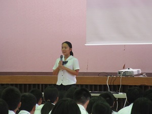 先生は、宝くじで1等を当てて世界一周旅行をするという夢があるけど、1度も宝くじを買ったことがないと話されました。それは夢があっても実現のために行動しないのと一緒であってみんなにはそれぞれの夢に向かって頑張ってほしいとおっしゃっていました。浦田先生のお話は、例えがわかりやすくとても聞きやすいものでした。
