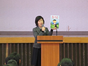 講話の中で、「へいわってすてきだね」という絵本を紹介してくださいました。この本は、2013年6月23日、沖縄戦全戦没者追悼式で当時6歳の安里有生(あさとゆうき)くんが朗読した「平和の詩」をもとにして作られた絵本です。平和の尊さをしみじみ感じることができる絵本でした。