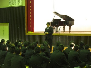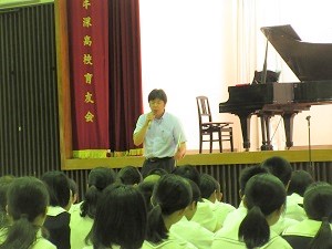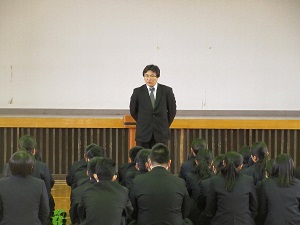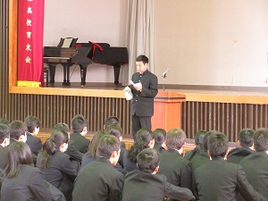 3月2日(火)、3月の全校朝礼が行われました。今月は、英語科の山口先生に講話をしていただきました。