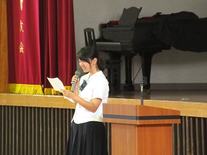 私は、開式・閉式の言葉を担当しました。前に立ち、1年次生の顔を見ると、緊張した顔つきでした。1年次生の礼がきれいにそろっていて、牛高生が増え、うれしく思う会でした。私たちも初心を忘れずに生活していきたいと思いました。