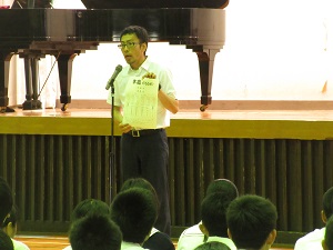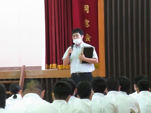 6月2日(火)、6月の全校朝礼が行われました。今月は、生徒会からのお知らせ、校長先生をはじめ各方面の先生方からの講話がありました。