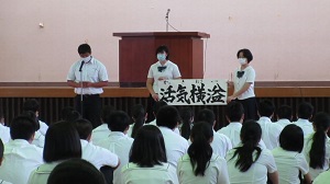 生徒会からは今年の生徒会のテーマ発表と生徒会役員改選についてのお知らせがありました。今年度の生徒会テーマは「活気横溢(かっきおういつ)」です。溌剌とした学校生活になるようにと、このテーマとなりました。新型コロナウイルスの影響で皆さんの生活にいろいろな影響が現れたと思いますが、それに負けずに私たちひとりひとりが牛深高校から元気を発信していきたいものですね。そして生徒会役員改選は今週11日(木)に行われます。この選挙を皮切りに、今年度の学校を引っ張っていくメンバーが決まっていきます。皆さんで活気あふれる牛深高校を創っていきましょう。