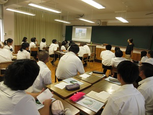 はじめに養殖業についてお話を伺いました。「世界は和食ブームとなっていて、和食の良さが見直されている。国内では、とる漁業から育てる漁業へ転換し、養殖業へのIOTやICTを活用した技術開発などで、日々養殖業は進化している。卒業後に地元を離れる人も、将来は地元に戻ってきて、若い力で地元を盛り上げてほしい。」とあいさつされました。そのあと、ブリと鯛の魚さばきのデモンストレーションを見学しました。家庭用の包丁でもあっという間にさばかれる職人技に生徒たちは驚いていました。