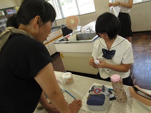 事前に学習した内容を振り返りながら、先生の手本を見学後、一人ずつ実習を行いました。生徒は、「湯加減の調節、片手で赤ちゃんを抱えることが難しい」と話していました。