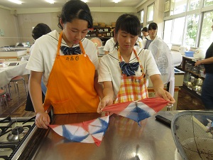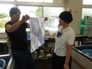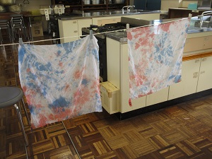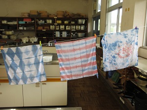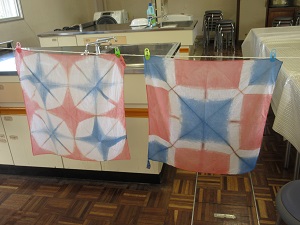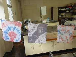 ハンカチの絞り方や折り方、染液につける時間や回数で色が変わり、時間と根気がいる作業でした。自分の理想の染め方にするにはどうしたらいいか講師の先生に質問したり、染め上がったハンカチを広げたときに、満足そうな表情を浮かべていました。