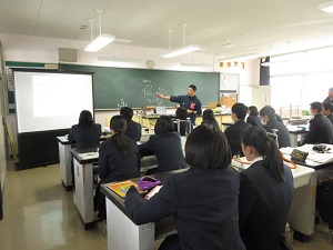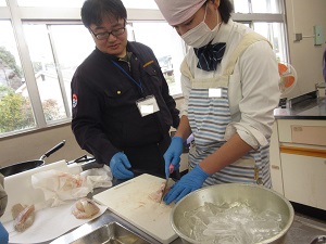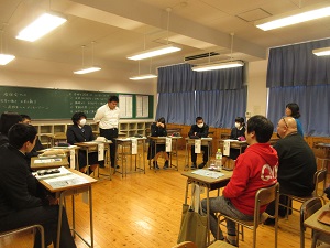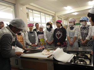 はじめに養殖業についてお話を伺いました。「世界は和食ブームとなっていて、和食の良さが見直されている。国内では、とる漁業から育てる漁業へ転換し、養殖業へのIOTやICTを活用した技術開発などで、日々養殖業は進化している。卒業後に地元を離れる人も、将来は地元に戻ってきて、若い力で地元を盛り上げてほしい。」とあいさつされました。そのあと、ブリと鯛の魚さばきのデモンストレーションを見学しました。家庭用の包丁でもあっという間にさばかれる職人技に生徒たちは驚いていました。