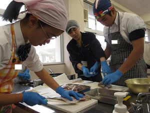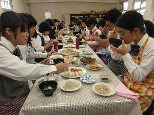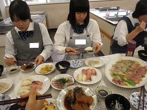その後、2人で1匹の鯛をさばきました。鯛をさばくのは初めての生徒ばかりでしたが、講師の先生にアドバイスをいただき鯛の刺身が完成しました。他にも、ブリのたたき、ブリのマヨネーズ焼き、潮汁、にぎり寿司、ブリのカルパッチョ、ブリのあら煮などテーブルいっぱいの料理7品をおいしくいただきました。